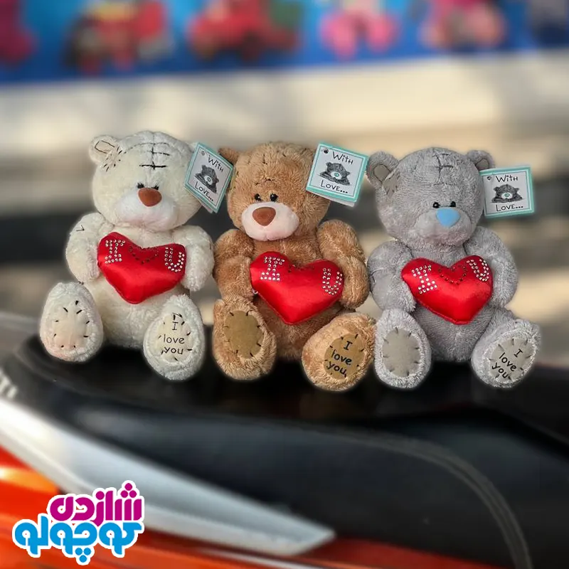 عروسک خرسی Me To you در رنگبندی های مختلفی که در تصویر مشاهده میکنید موجود است. از جمله خصوصیاتی که این محصولات دارند, میتوان به عبارت i love you که کف پای آن ها گلدوزی شده است اشاره نمود. همچنین یک لیبل کاغذی مخصوص نیز که رویش عکس خرس می تو یو و نوشته هایی که مشاهده میکنید وجود دارد.