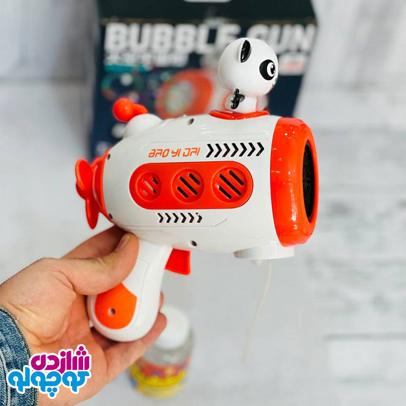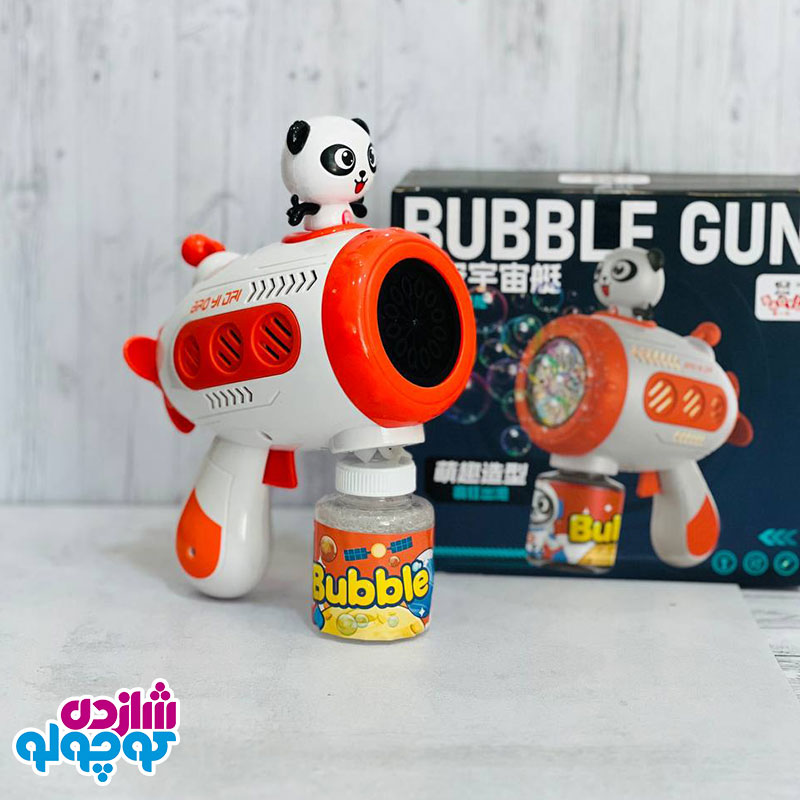 این اسباب بازی حباب ساز فانتزی بسیار جذاب است. درون بسته بندی آن یک عدد تفنگ به همراه عروسک پاندا است که میتوانید آن را در قسمت بالای آن فیکس کنید. یک عدد بطری که هم به دارای مایع حباب ساز است و هم به عنوان مخزن این تفنگ حبابساز استفاده میشود وجود دارد. شیلنگ هایی که از اسباب بازی حباب ساز در آمده است را داخل بطری میگذارید سپس آن را بسته و دکمه ی آن را فشار میدهید و تمام.